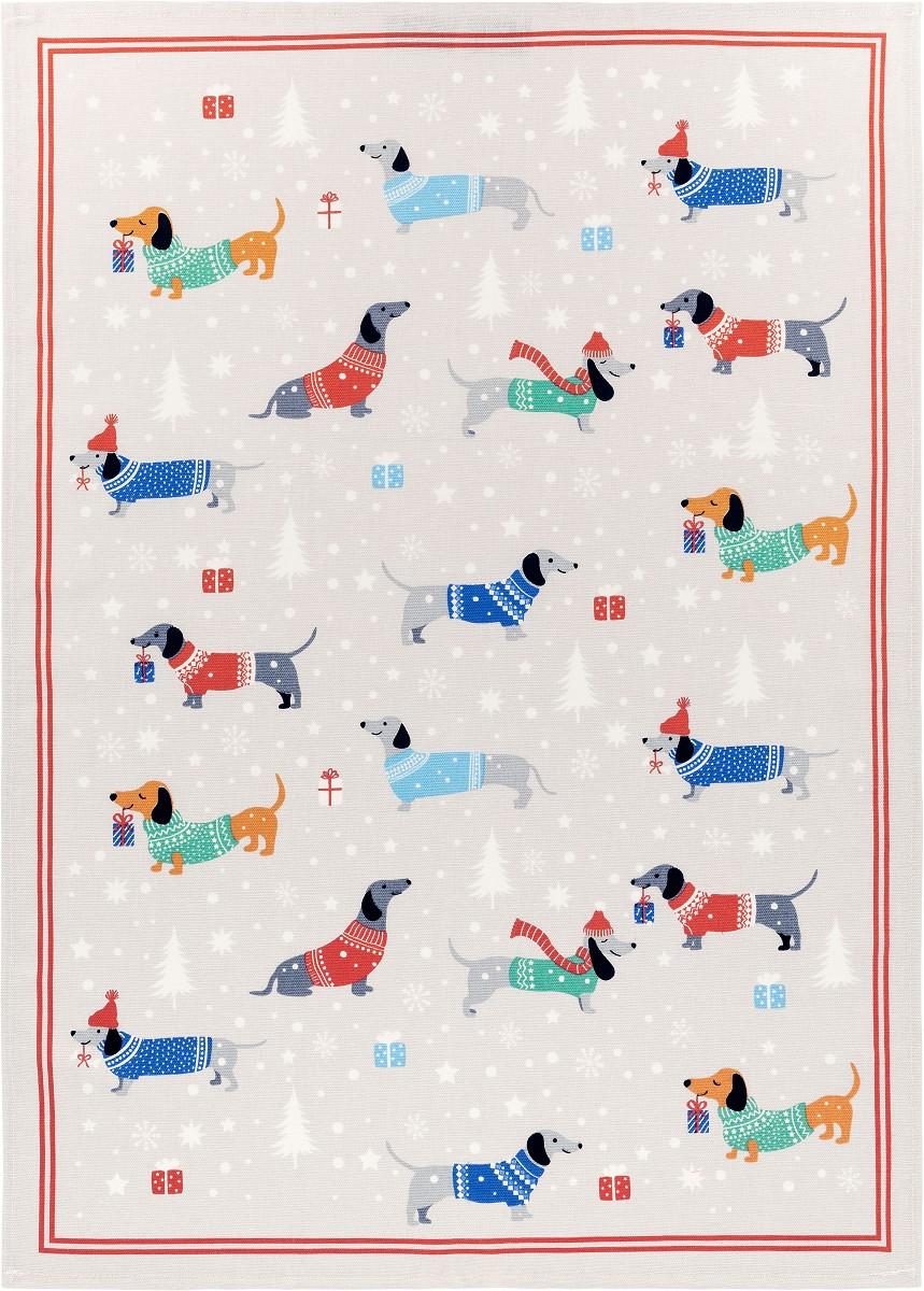 Zahlreiche Weihnachtsdackel versüßen Ihnen hier den Winter und versetzen uns sofort in Festtagsstimmung. Entdecken Sie die verschiedenen Vierbeiner auf dem hochwertigen Halbleinen-Tuch von Kracht. Die Materialkombination aus Baumwolle und Leinen verspricht ein möglichst fusselarmes Abtrocknen von Geschirr. Das lässt sogar beinahe den ungeliebten Abwasch nach dem großen Festessen zum Kinderspiel werden. Zumindest begegnen Sie dem Abwasch mit einem Lächeln – bei so einem Dackelblick.