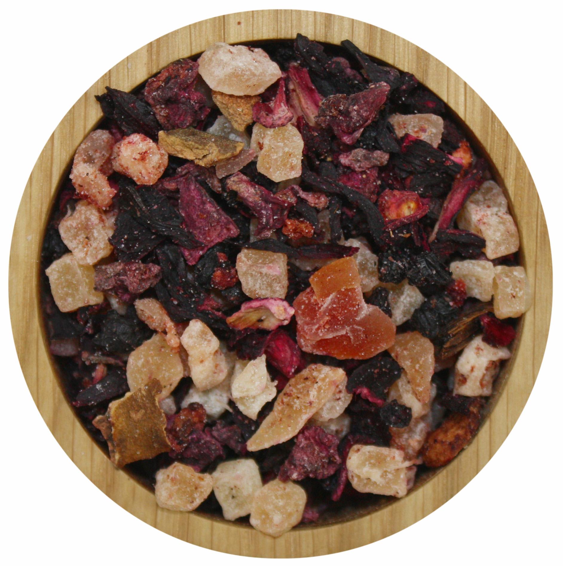 | Zutaten | Kandierte Ananasstücke (Ananas, Zucker), kandierte Papayastücke (Papaya, Zucker), Hibiskusblüten, Holunderbeeren, Rote-Bete-Stücke, natürliches Aroma, Erdbeerstücke (2 %), Guavestücke (2 %), Vanillestücke. |